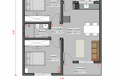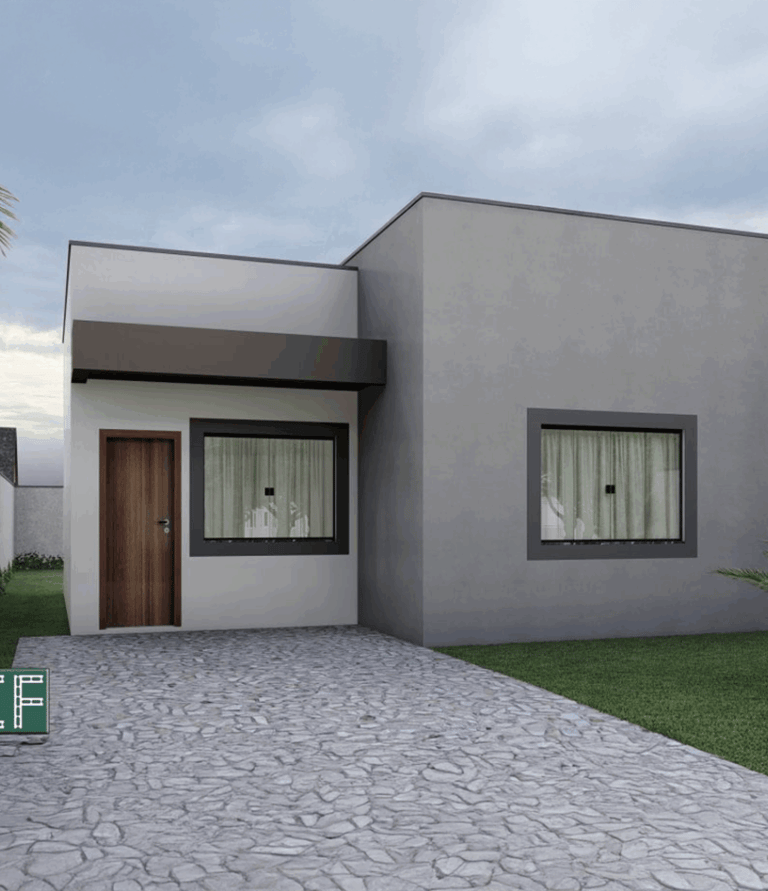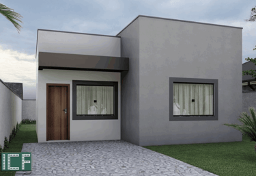 A solução para quem busca construir uma casa com uma fachada moderna e sem gastar muito, Kit Casa 01. Uma residência de 63,1 m² de 2 quartos, 1 banheiro social, sala e cozinha conjugada, com uma varanda frontal e uma lavanderia nos fundos e o melhor: Pode-se ampliar a casa para os fundos quando quiser! Pois essa planta foi pensada para quem deseja ampliação de uma futura suíte.