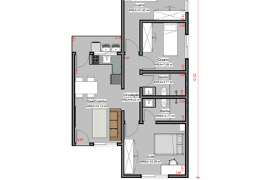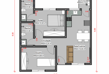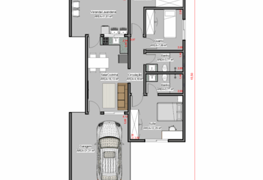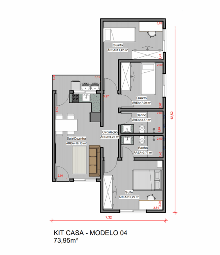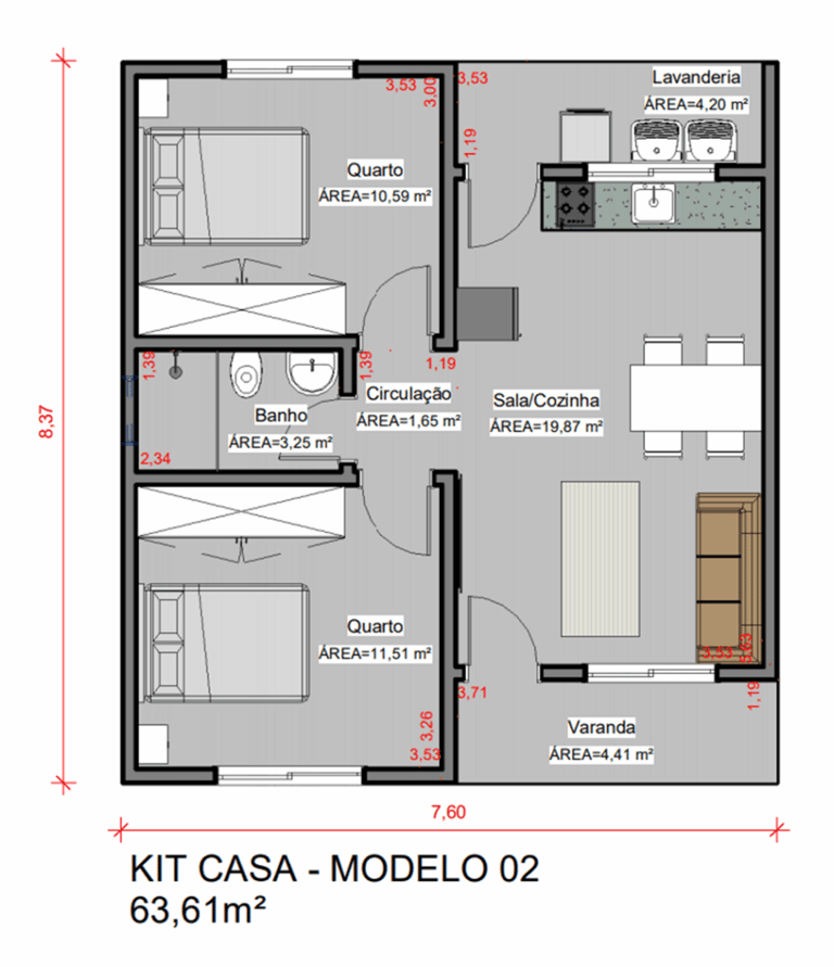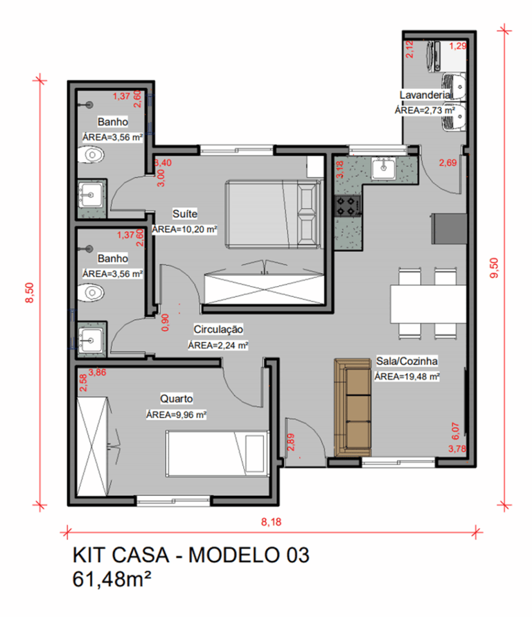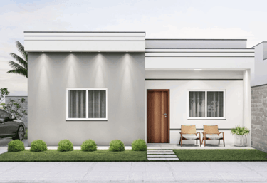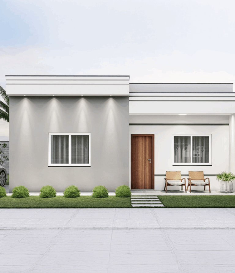 Para você que possui uma família maior, apresentamos o Kit Casa 03. Uma residência de 73,95m² de 2 quartos, 1 suíte, 1 banheiro social, sala e cozinha conjugada, com uma varanda frontal e uma lavanderia nos fundos.