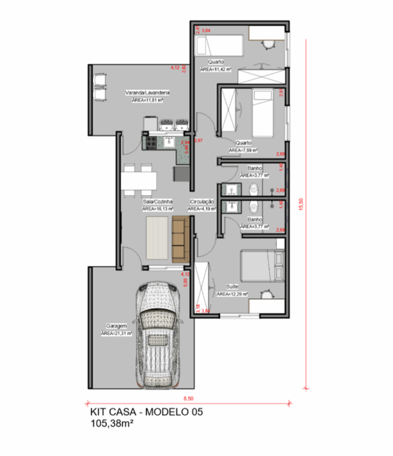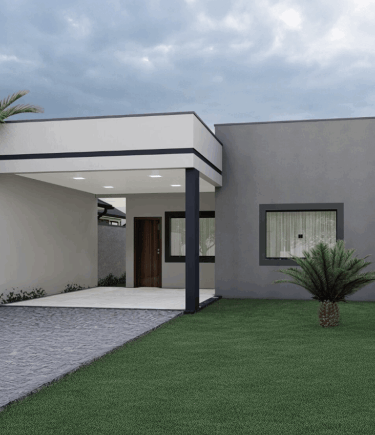 O kit casa 04 em uma versão expandida! A versão final e ideal para a família desfrutar de todo o conforto e comodidade. Uma residência de 105,38 m² de 2 quartos, 1 suíte, 1 banheiro social, sala e cozinha conjugada, com uma garagem e uma lavanderia com varanda nos fundos.